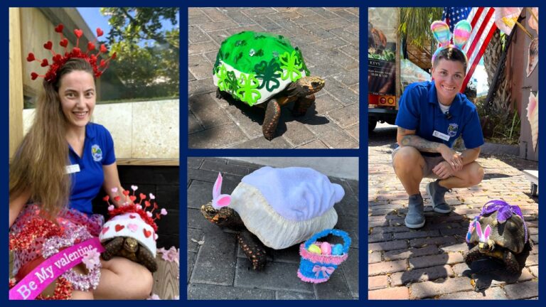 On Valentine’s Day, the love story between Senior Aquarist Brooks Barret and Turkey the tortoise continued. These two love a photo opportunity and both are great sports, donning festive outfits for holidays. Aquarist AmMathee Stott joined the fun for Easter!